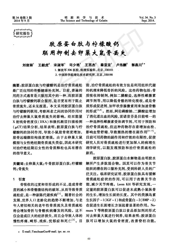 膠原蛋白肽與檸檬酸鈣聯(lián)用抑制去卵巢大鼠骨丟失