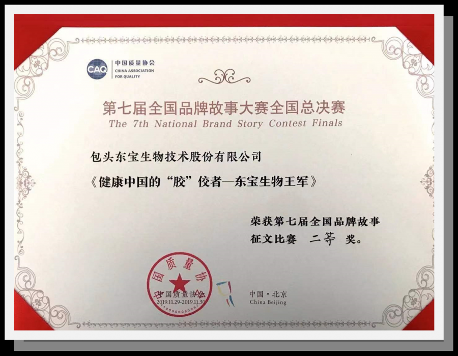 由中國質(zhì)量協(xié)會主辦、中國質(zhì)量協(xié)會品牌分會承辦的第七屆全國品牌故事大賽全國總決賽于2019年11月27-29日在北京舉行,本屆大賽以“品牌升級,世界共享”為主題,鼓勵各行業(yè)企業(yè)深入挖掘品牌內(nèi)涵,以多視角、多形式講好品牌故事,積極塑造和傳播中國品牌形象。我公司由質(zhì)管部張紅飛撰寫的品牌故事《健康中國的“膠”佼者--東寶生物王軍》獲得了全國品牌故事大賽征文二等獎的殊榮。
